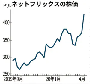19年12月末と比べて700万人増えるとみていた今年3月末の有料会員数は、1577万人の純増となり、異例の伸びをみせた。世界で1億8200万人がネットフリックスを視聴し、純利益は7億906万ドル(約764億円)と前年同期比2.1倍に拡大。投資家はネットフリックスをコロナ禍の「勝ち組」とみており、株価は430ドル超と上場来高値圏で推移している。
