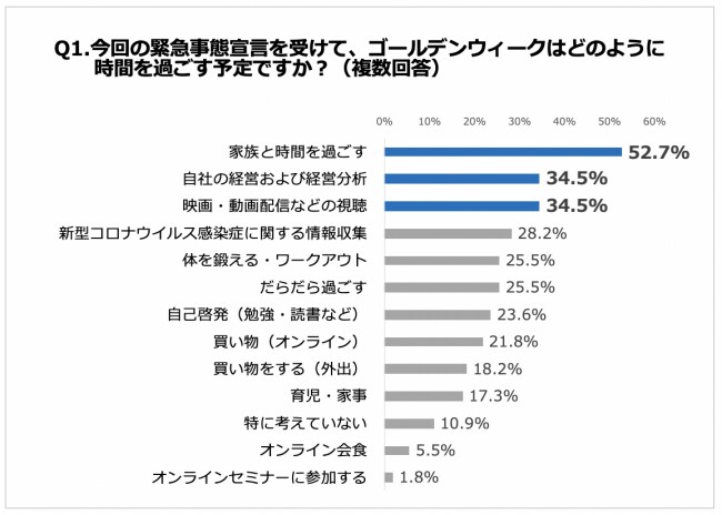 経営者へ「Q1. 今回の緊急事態宣言を受けて、ゴールデンウィークはどのように過ごす予定ですか?」(n=110)と質問したところ、「家族と時間を過ごす」が52.7%、「自社の経営および経営分析」が34.5%という回答となりました。