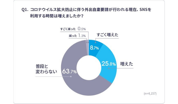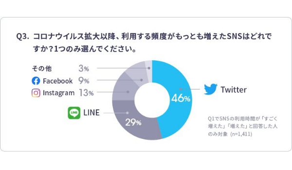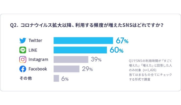 コロナウイルスの流行により、外出自粛要請が行われている現在、SNSの利用時間が増えたと回答したユーザーは全体の34.5%。このうち、利用する頻度が増えたSNSは全体の67%が「Twitter」、60%が「LINE」と回答した。