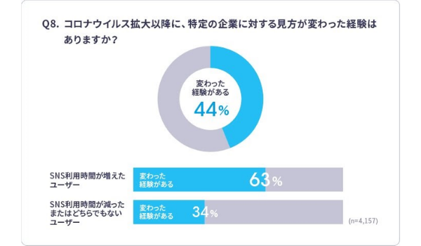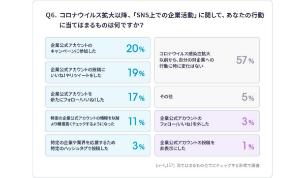 先ほどコロナウイルス関連の情報収集が主な利用目的と述べたが、企業の活動にも多くの目が向けられているのだ。コロナウイルス拡大以前と「対企業への行動に特に変化はない」と57%が回答したのに対し、「新たに良いねしてフォローした」などポジティブな行動をとった人が全体の約20%が回答。要は5人に1人は企業を応援する動きをしている。