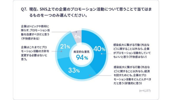 また、「SNS上での企業のプロモーション活動」について質問したところ、約94%が肯定的だった。感染拡大につながる行動に関すること以外であれば、40%が「企業がプロモーション活動をしていてもいいと思う(不快感はない)」、とユーザーは回答し、生活に大きな影響が出ている消費者が多い中、プロモーションの企画内容や伝えるメッセージについては十分に配慮をする必要があるが、プロモーションの実施そのものを自粛する必要はないと考えられる。