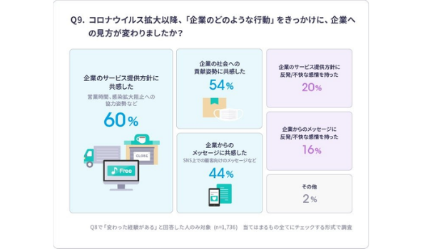 企業への見方がプラスに変わった理由としては、「企業のサービス提供方針に共感した」や「企業からのメッセージに共感した」ことが挙げられる。回答したユーザーの中には、いち早くテレワークを導入するなど「従業員を大事する姿」から企業への見方がプラスに変わったとの意見が多数見られた。