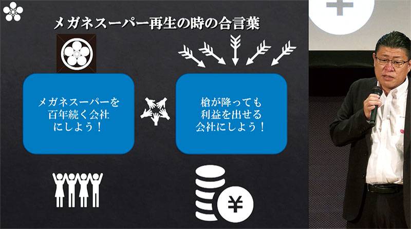 当時、ファンド主導で経営改革を進めていたものの事態は好転せず、社内の士気は下がっていくばかり。そうした中、僕は「メガネスーパーを100年続く会社にしよう」「槍が降っても利益を出せる会社にしよう」を合言葉に、改革を進めていきました。