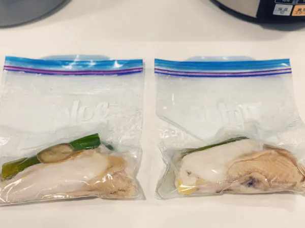 今回作ってみたのは、BONIQの低温調理専門レシピサイトに掲載されていた「史上最強に柔らかい蒸し鶏」。鶏むね肉と一緒に白ネギの青い部分やショウガの皮、ゴマ油などをフリーザーバッグに入れて、60度で1時間30分調理する。下準備ができたら、鍋に入れて待つだけだ。給湯器で50度くらいのお湯を入れれば、数分で60度になる。比較をしてみるために、自宅にあった電気圧力鍋でも同じレシピで蒸し鶏を作ってみた(ただし、温度は最低でも70度にしか設定できないので、調理時間は異なる)。