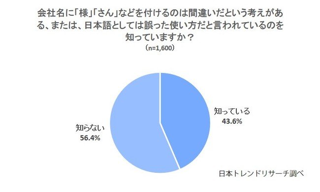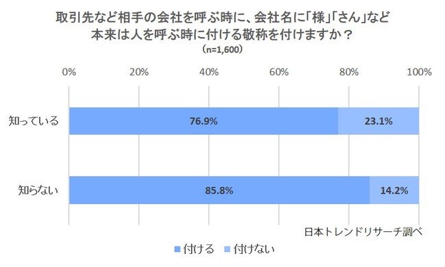 また、85.8%の方は、間違いだと言われていることを知らずに会社名に「様」「さん」を付けて使っているようです。