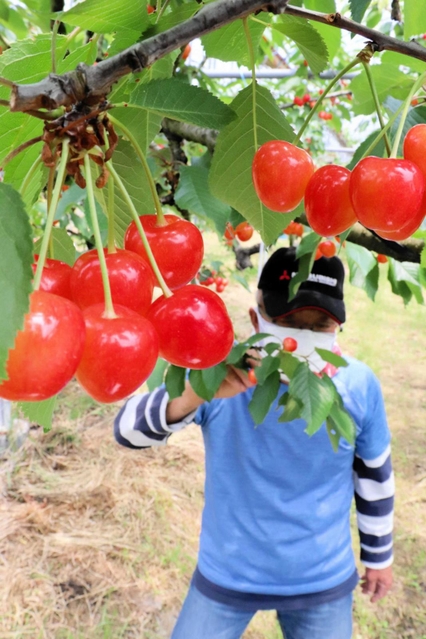 苦境に立つ同園だが、サクランボは例年通り豊作。園主の駒谷幸正さん(70)によると、大粒で色づきが良く、甘酸っぱい「香夏錦(こうがにしき)」の出来がいいという。友人と訪れた同県姫路市の主婦(53)は「木によって味が全然違う。3密の心配もないし、安心して楽しめる」と笑顔だった。