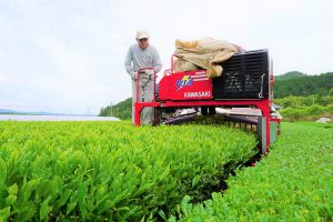 「可搬型摘採機」と呼ばれる山型の機械の両端を2人で持って刈り取ったり、「乗用型摘採機」で収穫したりしている。