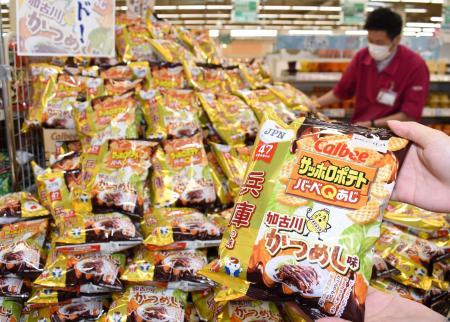 兵庫県加古川市のご当地グルメかつめしが、スナック菓子になって再び登場した。カルビー(東京)が、数量限定で昨年発売した「サッポロポテトバーベQあじ 加古川かつめし味」を、7月下旬から再販売している。エリアは近畿2府4県から全国に拡大。地元をPRする好機とみた加古川観光協会が、全国での“目撃情報”を写真で募っている。47都道府県がそろえば、投稿者に抽選で牛肉などの「かつめしセット」を贈る。