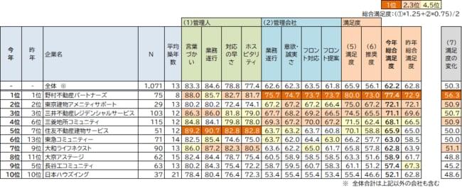 全体ランキングの総合満足度1位は、野村不動産パートナーズ(74.6ポイント)でした。次いで、三井不動産レジデンシャルサービス(74.0ポイント)、東京建物アメニティサポート(70.7ポイント)という結果になりました。野村不動産パートナーズは、(2)管理会社に対する評価が非常に高く、すべての項目で1位を取り、総合力においても(5)満足度と(6)推奨度の得点が共に全体1位でした。野村不動産パートナーズは今回の結果により、13年連続の1位となりました。三井不動産レジデンシャルサービスは、(1)管理人の対応の早さの項目で非常に高い得点を取り、(5)満足度・(6)推奨度ともに評価が上がり、総合2位に躍進しました。東京建物アメニティサポートは、(2)管理会社に対する評価・総合力で評価され、(5)満足度・(6)推奨度ともに高い評価を受け、3位となりました。