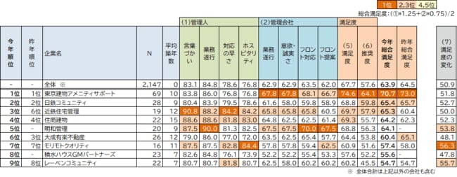 また、全体ランキングの(7)昨年度と比較した満足度の変化では、レーベンシリーズで単身からファミリーまで幅広い物件を供給したタカラレーベングループのレーベンコミュニティ(55.7ポイント)が1位となりました。