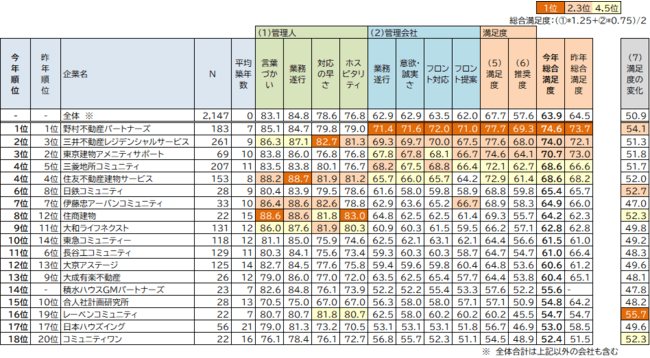 <図表1:管理会社満足度 全体ランキング 上位18社 主要項目抜粋>