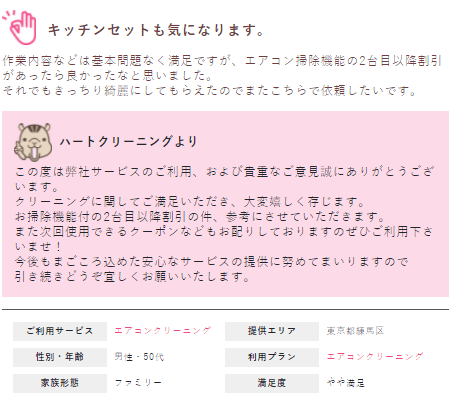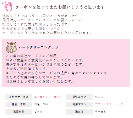 また、一度弊社でエアコンクリーニングを行って頂くと、次回使えるクーポンの配布を行っているため、またそのクーポンを使って次回も予約をしたいという声も多かったです。