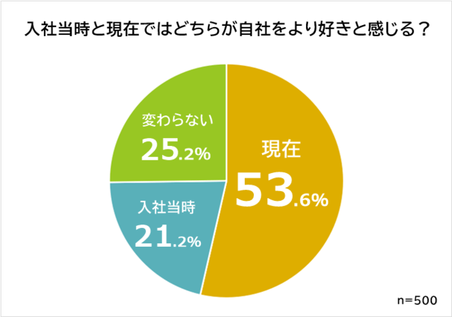 また「入社時よりも会社が好きになった」という人は53.6%。
