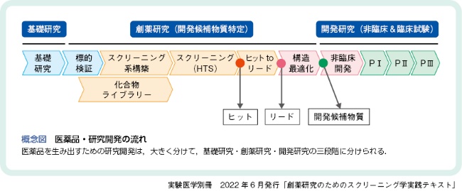 医薬品の研究開発の流れは、概念図のように示される。ここに示された一連の過程は、医薬品を開発するためのスクリーニングカスケードであるともいえる。しかし、本書は、「スクリーニング(HTS)とその周辺」に焦点を当てており、本書で述べる「スクリーニングカスケード」とは、この図の「スクリーニング(HTS)」のなかのヒット確定まで、またはその後の「ヒットtoリード」までが対象である。