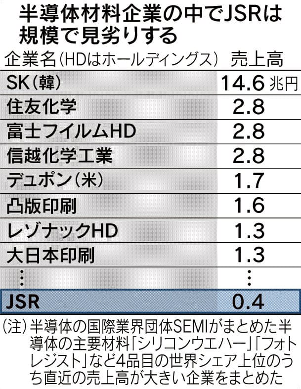 半導体材料大手のJSRが政府系ファンドの産業革新投資機構(JIC)の傘下に入る。合成ゴムの国産化を目指した官製会社を源流とするが、約55年ぶりに「国策会社」に回帰する。米中対立を機に最先端の半導体技術の囲い込み競争が世界で激しさを増す。日本の半導体素材産業は世界シェアは高いが、プレーヤーが多い。勝ち残りに向けた再編が動き出した。